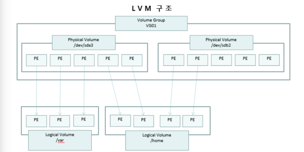 => 디스크를 추가 및 변경 시에 물리적인 부분을 건들이지 않을 수 있으며, 사용중인 파티션의 크기 변경도 간편함
