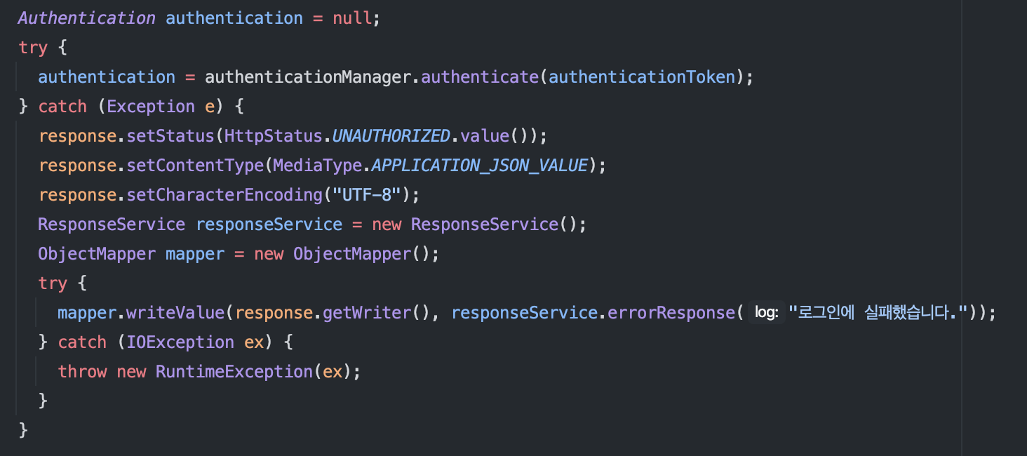 오류가 나면 로그인에 실패했다는 문구와 상태코드를 반환해주어야 하므로, 위의 사진과 같이 하면 filter에서도 response 처리를 할 수 있다