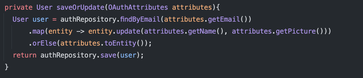 saveOrUpdate란 말 그대로 findByEmail을 통해 DB에 값이 없으면 값을 save한다