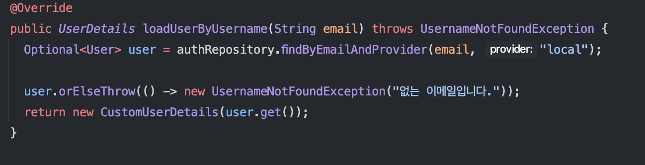 oauth2 로그인과 자체 로그인은 provider로 구분하게 해놓았는데, 이부분에서는 구분이 안되니 여기서 문제가 생겼을 것이라 생각했다