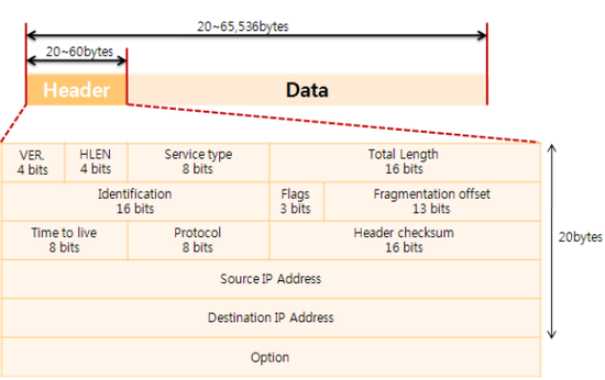 - 헤더 필드 : 패킷을 목적지까지 전송하기 위해 IP 계층에서 필요한 값들이 포함