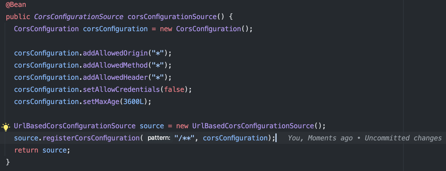 스프링부트 2.4.0부터 AllowCredentials가 true일때는 AllowdOrigin에 *를 추가할 수 없고, 대신 AllowOriginPattern을 사용해야 한다고 한다